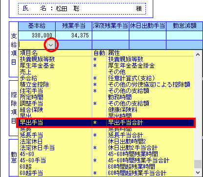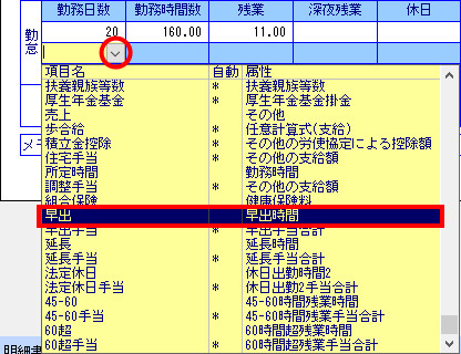 | 2)項目名欄の右側に表示される[▼]ボタンをクリックし、項目リストの中から[早出手当]をクリックします。 |