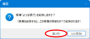 | (3) | 「帳簿「○○」を削除しますか?」というメッセージが表示されますので[はい]ボタンをクリックします。 |