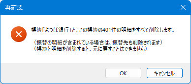 | ※帳簿を削除すると、その帳簿の明細行および振替先の明細がすべて削除されます。削除を実行すると元に戻すことはできませんのでご注意ください。念のため作業前にバックアップを取ることをお勧めします。 |