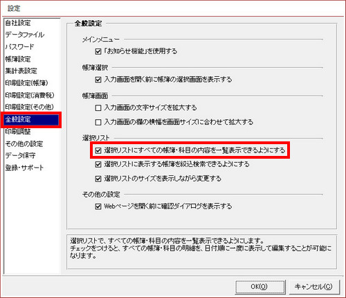 | (2) | [全般設定]をクリックし、[選択リストにすべての帳簿・科目の内容を一覧表示できるようにする]にチェックをつけ、[OK]ボタンをクリックします。 |