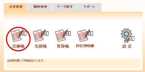 | (3) | メインメニューの[出納帳]アイコンをクリックし、任意の帳簿を開きます。 |