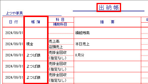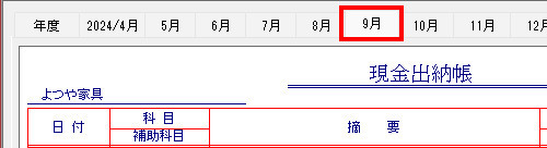 | (6) | 帳簿画面のタイトルが「出納帳」になり、2024年9月に入力されているすべての出納帳明細が表示されていることを確認します。 |