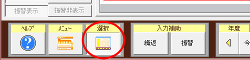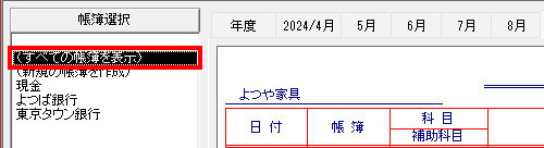 | (5) | 帳簿画面左下にある[選択]ボタンを押し下げ、画面左側に表示される[帳簿選択]欄から「(すべての帳簿を表示)」をクリックします。 |
