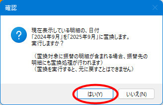 | ※日数の多い月の明細すべてを日数の少ない月に置換すると、置換先の日付が存在しない場合があります。その場合は、置換先の日付が存在する明細のみ置換されます。(例えば1月の明細をすべて6月に置換する場合、6月31日は存在しないため、1月31日の明細は置換されずにそのまま残ります) |