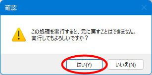 | (10) | 確認メッセージが表示されますので、実行して良い場合は[はい]ボタンをクリックします。 |