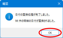 | (11) | 「○件の明細を置換しました。」というメッセージが表示されますので、[OK]ボタンをクリックします。 |