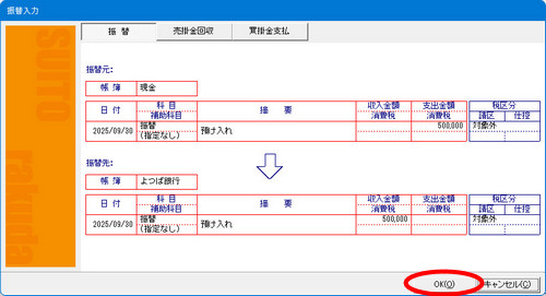 | 振替明細は、帳簿上で互いに連動しています。一方の内容(日付・金額)を変更すると、相手側の明細も自動的に更新されます。 |