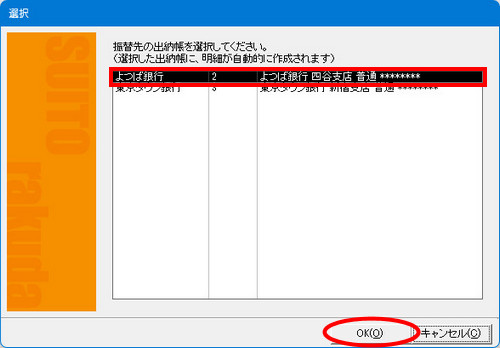 | (2) | 金額を入力し、[Enter]キーで進むと、「選択」(または「振替先指定」)画面が表示されますので、振替先(相手側)の出納帳を選択し、[OK]ボタンをクリックします。 |