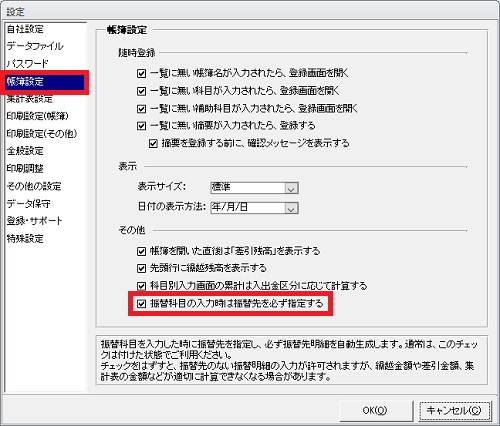 | ※「振替先指定」画面が表示されない場合は、メインメニューの[設定]アイコンをクリックし、[帳簿設定](または[全般設定])にある[振替科目の入力時は振替先を必ず指定する]にチェックをつけてください(「出納らくだ20」「かるがるできる出納20」とそれ以前のバージョン製品の場合)。 |