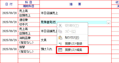 | (1) | 帳簿画面で、すでに入力されている明細行の中から、編集または削除したい摘要が登録されている行の摘要欄で右クリックします。 |