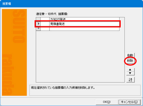 | (3) | 「摘要欄」画面が表示されますので、対象の文字列をクリックし、カーソルを挿入して編集します。削除したい場合は、カーソルを挿入した状態で右側の[削除]ボタンをクリックし、確認メッセージが表示されますので、[はい]ボタンをクリックします。 |