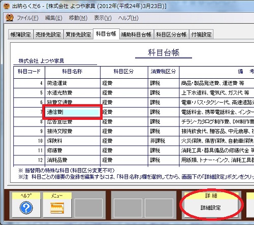 | (3) | 編集または削除したい摘要が登録されている科目の行をクリックしてカーソルを置いた状態で、画面下部の[詳細設定]ボタンをクリックします。 |