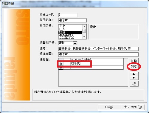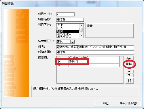 | (4) | 「科目登録」画面が表示されますので、[摘要欄]の中で対象の文字列をクリックし、編集を行います。削除したい場合は、右側の[削除]ボタンをクリックし、確認メッセージが表示されますので、[はい]ボタンをクリックします。 |