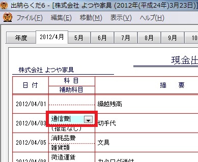 | (1) | 帳簿画面で、すでに入力されている明細行の中から、編集または削除したい摘要が登録されている科目名をダブルクリックします。 |