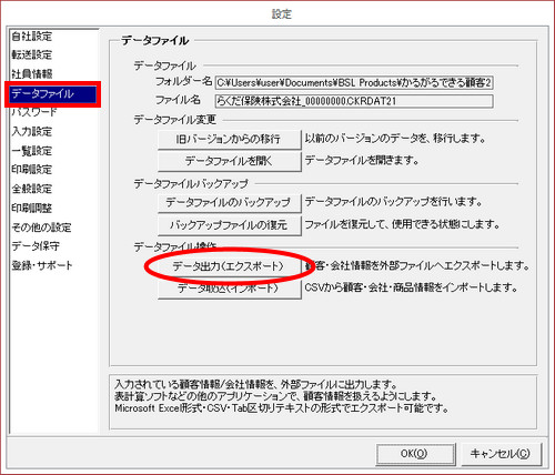 | (2) | [データファイル]をクリックし、[データ出力(エクスポート)]ボタンをクリックします。 |