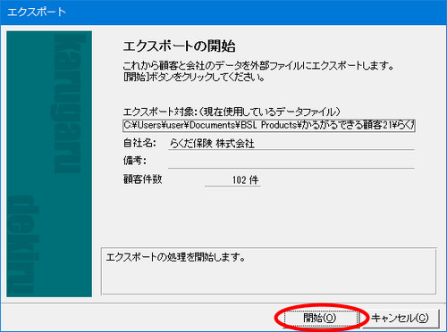 | (3) | 「エクスポートの開始」画面が表示されますので、[開始]ボタンをクリックします。 |