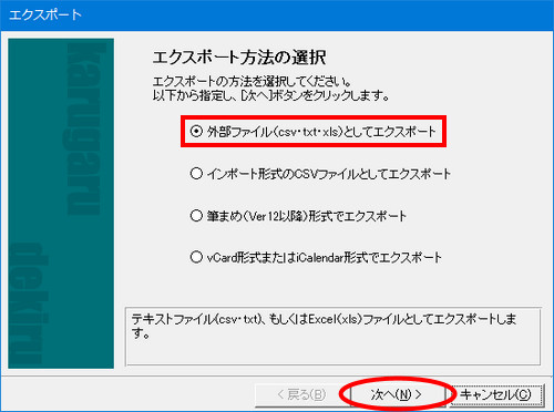 | (4) | 「エクスポート方法の選択」画面が表示されますので、[外部ファイル(csv・txt・xls)としてエクスポート]を選択し、[次へ]ボタンをクリックします。 |