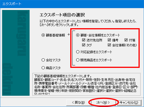 | (5) | 「エクスポート項目の選択」画面が表示されますので、エクスポートしたい項目を選択し、[次へ]ボタンをクリックします。 |