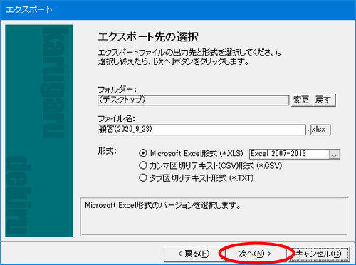 | (6) | 「エクスポート先の選択」画面が表示されますので、保存先のフォルダー・ファイル名・ファイル形式を指定し、[次へ]ボタンをクリックします。 |