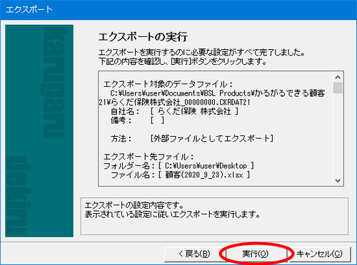 | (7)「エクスポートの実行」画面が表示されますので、[実行]ボタンをクリックします。 |