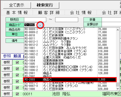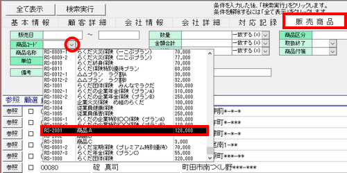 | (2) | 画面上部の[販売商品]タブをクリックし、[商品コード]欄の[▼]ボタンをクリックして、「A商品」を選択します 。 |