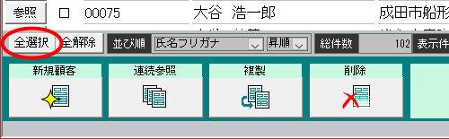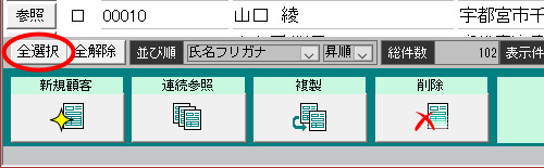 | (4) | 一覧に「A商品を買った人」が抽出されますので、画面左下の[全選択]ボタンをクリック して、[顧選]欄にチェックを付けます。 |