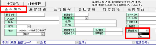 | さらに、画面上部の[基本情報]タブをクリックして、[顧客選択]欄の[▼]ボタンをクリックし、「Yes」を選択します 。 |