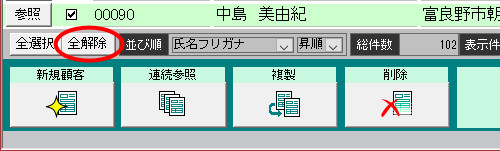 | (10) | 一覧に「A商品またはB商品を買った人のうち、C商品を買った人」が抽出されますので 、画面左下の[全解除]ボタンをクリックし、[顧選]欄のチェックを外します。 |