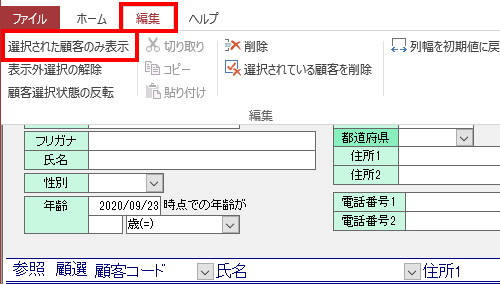 | (11) | 画面上部の[編集]メニューをクリックし、[選択された顧客のみ表示]をクリックします。(6)と同じ確認メッセージが表示された場合は、[いいえ]ボタンをクリックします。 |
