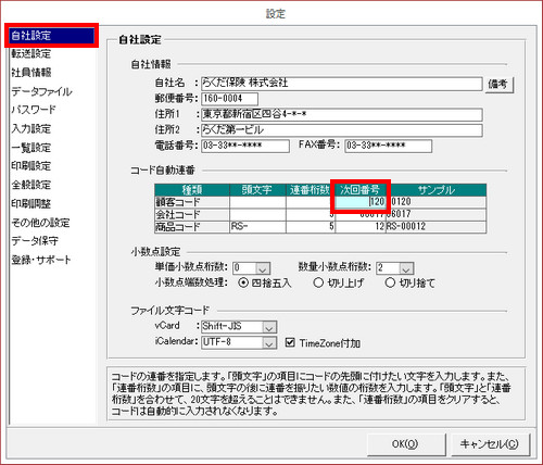 | (2) | [自社設定]内の「コード自動連番」の中で、[顧客コード]欄の[次回番号]を任意の数値に書き換えます。 |