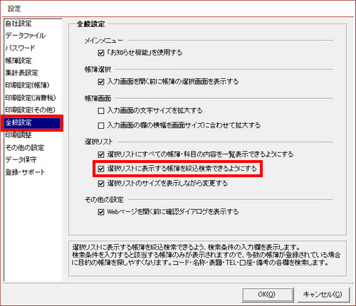 | (2) | [全般設定]をクリックし、[選択リストに表示する帳簿を絞込検索できるようにする]にチェックをつけます。 |