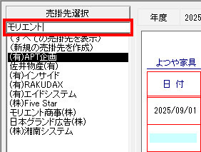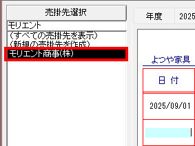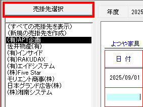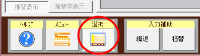 | (4) | 任意の帳簿画面を開き、帳簿画面左下にある[選択]ボタンを押し下げ、画面左側に[帳簿選択]等の欄を表示します。(画像例は[売掛先選択]) |