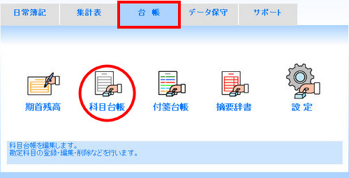 | (1) | メインメニューの[台帳]タブをクリックし、[科目台帳]アイコンをクリックします。 |