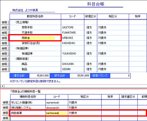 | (2) | 「科目台帳」画面が表示されますので、「買掛金」または「売掛金」の行内をクリックし、画面下部に表示されている「補助科目一覧」の新規行に、登録したい取引先の情報を入力します。 |