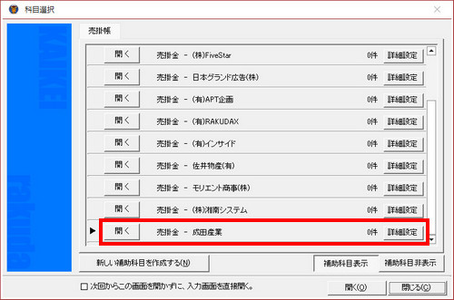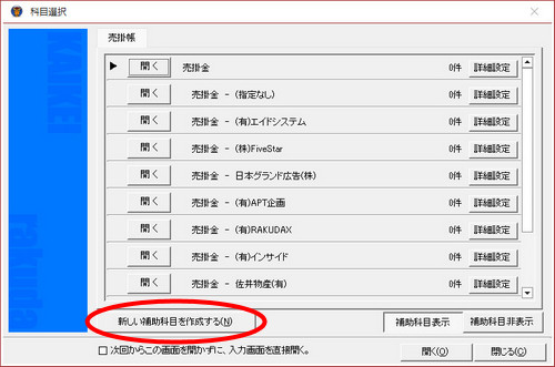 | (2) | 「科目選択」画面が表示されますので、[新しい補助科目を作成する]ボタンをクリックします。 |