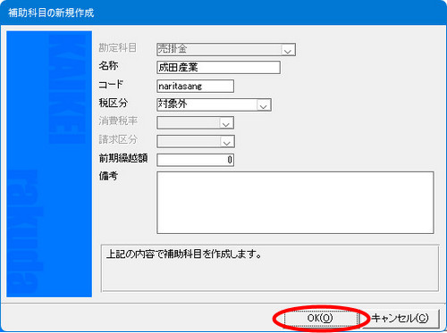 | (3) | 「補助科目の新規作成」画面が表示されますので、登録したい取引先の情報を入力し、[OK]ボタンをクリックします。 |