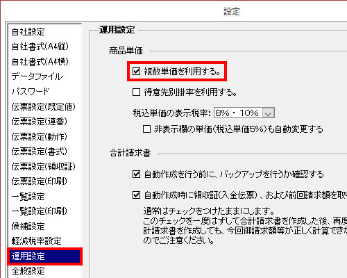 | (1- | 2)[運用設定]をクリックし、[複数単価を利用する]にチェックをつけます。 |