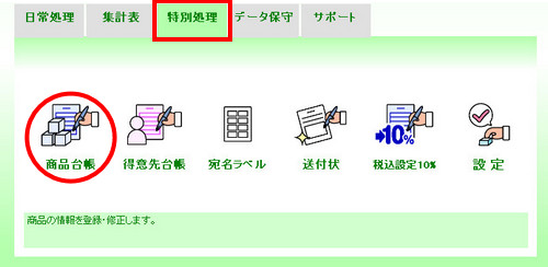 | (2- | 1)メインメニューの[特別処理]タブをクリックし、[商品台帳]アイコンをクリックします。 |