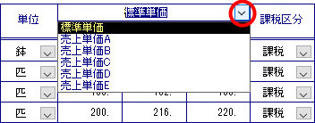 | なお、一時的に別の単価種別を使用したい場合は、[単価]欄にカーソルを置いた状態で、候補リストに表示される単価種別の中から選択してください。 |