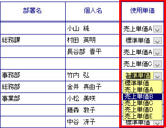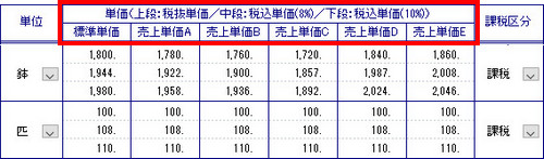 | 横形式:下図のように単価の全種別が表示されますので、商品ごとに各単価を入力していきます。 |