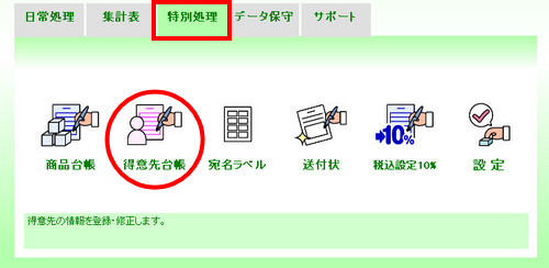 | (3- | 1)メインメニューの[特別処理]タブをクリックし、[得意先台帳]アイコンをクリックします。 |