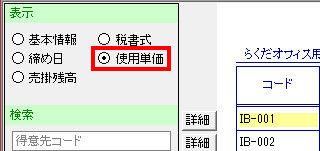 | (3- | 2)「得意先台帳」画面左下の[検索]ボタンを押し下げ、画面左上の「表示」内から、[使用単価]をクリックします。「得意先台帳」画面に[使用単価]欄が表示されますので、各得意先に使用する単価種別を設定します。 |