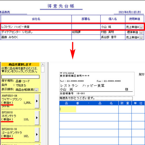 | 上記の作業後、伝票作成画面で、商品の候補リストに、宛先に指定した得意先の使用単価が表示されていることをご確認ください。 |