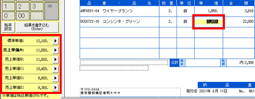 | 縦形式:下図の部分で単価の種別を切り替え、[税抜][税込]を入力します。 |