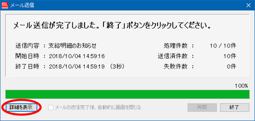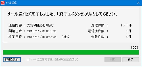 | メールの送信処理が開始すると、「メール送信」画面が表示されます。「メール送信」画面ではメールの送信状況を確認することができます。また、送信処理を中断したり、詳細情報を表示したりすることができます。 |