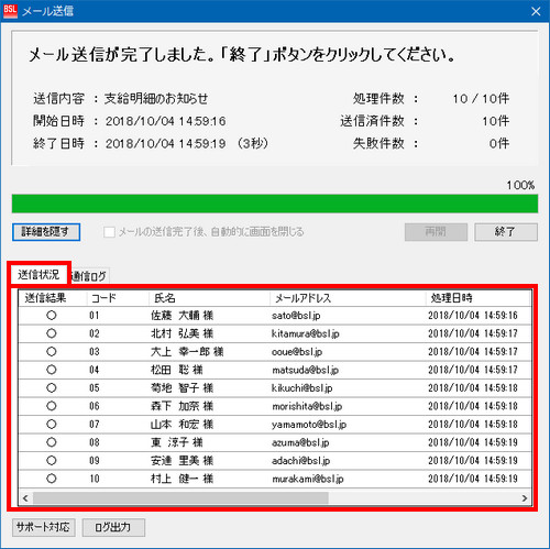 | [送信状況]タブには、メール一通ごとの送信状況が表示されます。「メールが正しく送信されているか」「どのアドレスにいつメールを送信したか」等の詳細情報を確認することができます。 |