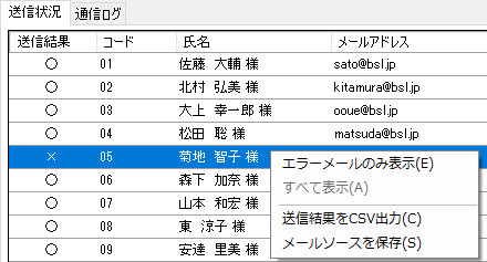 | [送信状況]タブの一覧で右クリックすると、メニューが表示されます。 |