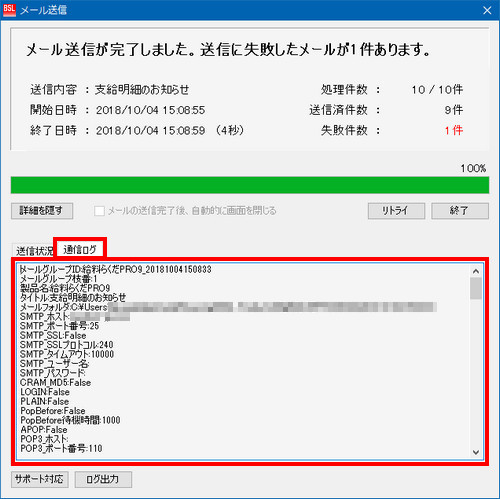 | [通信ログ]タブをクリックすると、メールの通信ログが表示されます。 |
