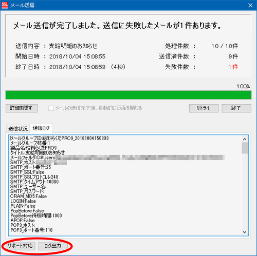 | ※ご利用の製品によって、ログ内に下図のように「MailTo_アドレス:rakuda@bsl-jp.com」という文字が含まれます。このメールアドレスは[サポート対応]ボタンをクリックした際の既定の送信先アドレスとして使用するものです。メールの中身を弊社に送信しているわけではありませんので、ご了承ください。 |