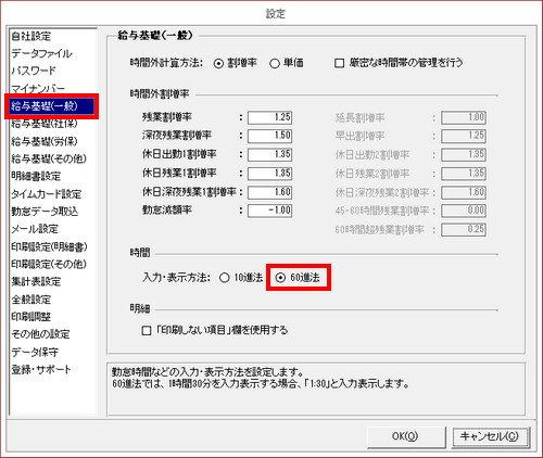 | (2) | [給与基礎(一般)]項目をクリックし、「入力・表示方法」にある[60進法]を選択します。 |